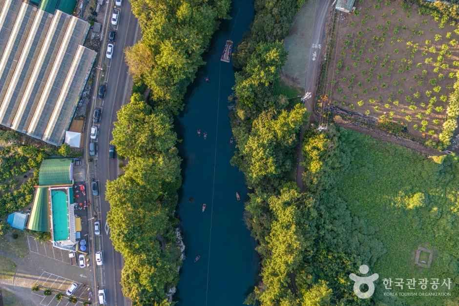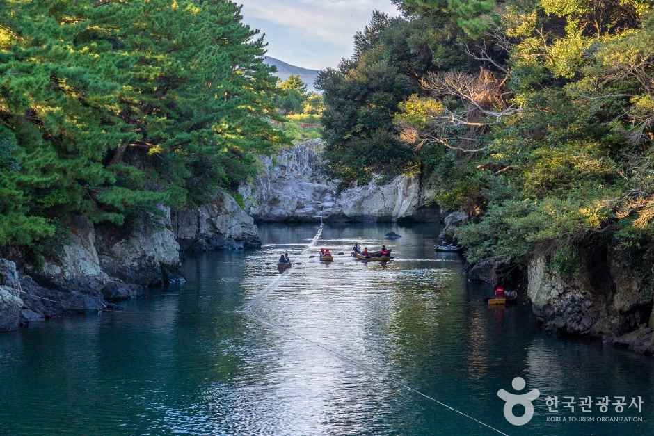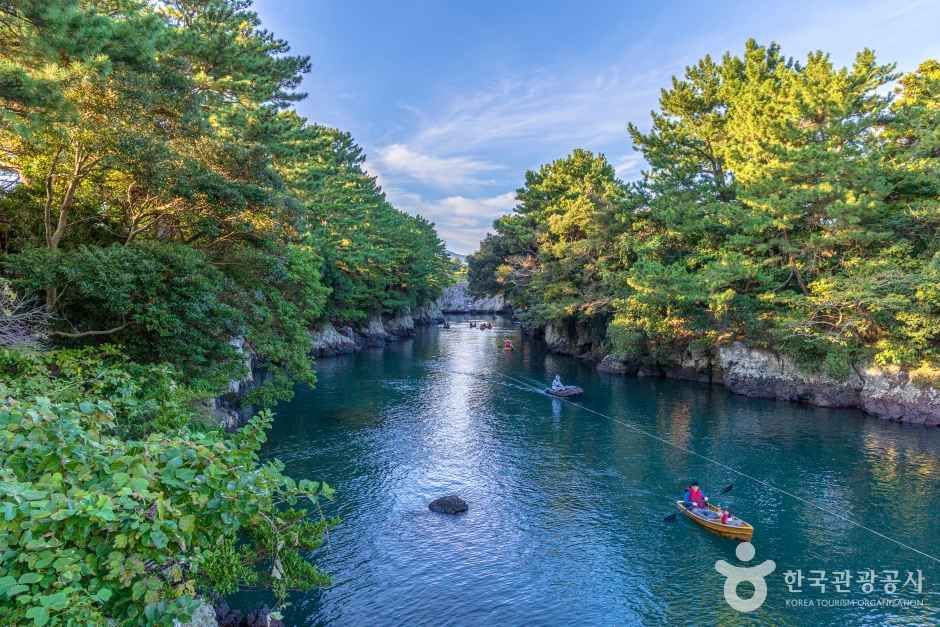 제주도 서귀포시 하효동에 있는 쇠소깍은 원래는 소가 누워있는 형태라 하여 쇠둔이라는 지명이었는데, 효돈천을 흐르는 담수와 해수가 만나 깊은 웅덩이를 만들고 있어 ‘쇠소깍’이라고 붙여졌다. 쇠는 소, 소는 웅덩이, 깎은 끝이라는 의미를 담고 있다. 쇠소는 용암이 흘러내리면서 굳어져 형성된 계곡 같은 골짜기로 이름만큼이나 재미나고 독특한 지형을 만들고 있다. 쇠소깍은 서귀포칠십리에 숨은 비경 중 하나로 깊은 수심과 용암으로 이루어진 기암괴석과 소나무숲이 조화를 이루면서 아름다운 풍광을 연출한다. 쇠소깍이 위치한 하효동은 한라산 남쪽 앞자락에 자리 잡고 있어 감귤의 주산지로 유명하여 마을 곳곳에 향긋한 감귤 냄새가 일품이다. 주변에는 주상절리대와 중문해수욕장, 천제연 폭포 등 유명한 관광지가 많아 함께 둘러보기에 좋다.